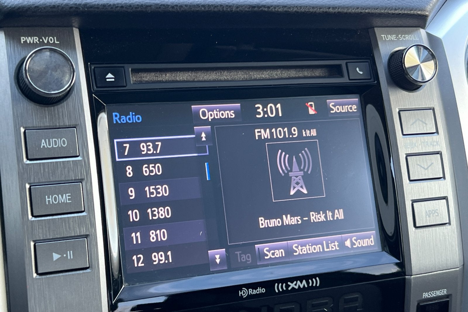- Radio: Entune Audio Plus -inc: AM/FM/HD radio, CD player MP3/WMA playback capability, navigation, high-resolution 7" touch-screen display, auxiliary audio jack, USB 2.0 port, iPod connectivity and control, iTunes Tagging, traffic and weather, Bluetooth® hands-free phone capability, phone book access, voice recognition and music streaming, SIRIUSXM Satellite Radio, 90-day free trial